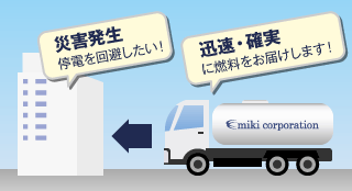 株式会社ミキコーポレーションでは災害時・緊急時に発電用の燃料や、ガソリン、軽油・重油などの燃料配達を円滑に行う体制を整えております。